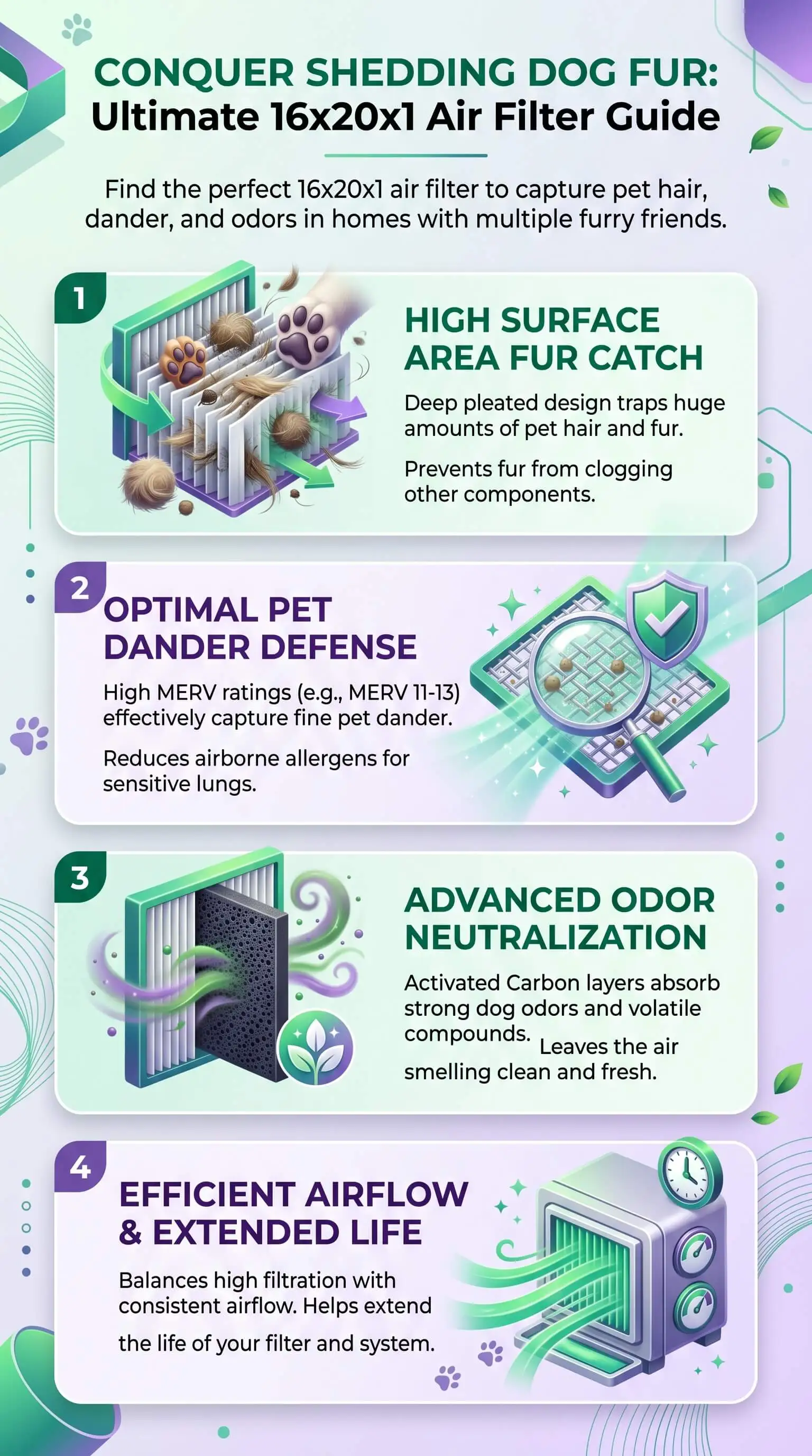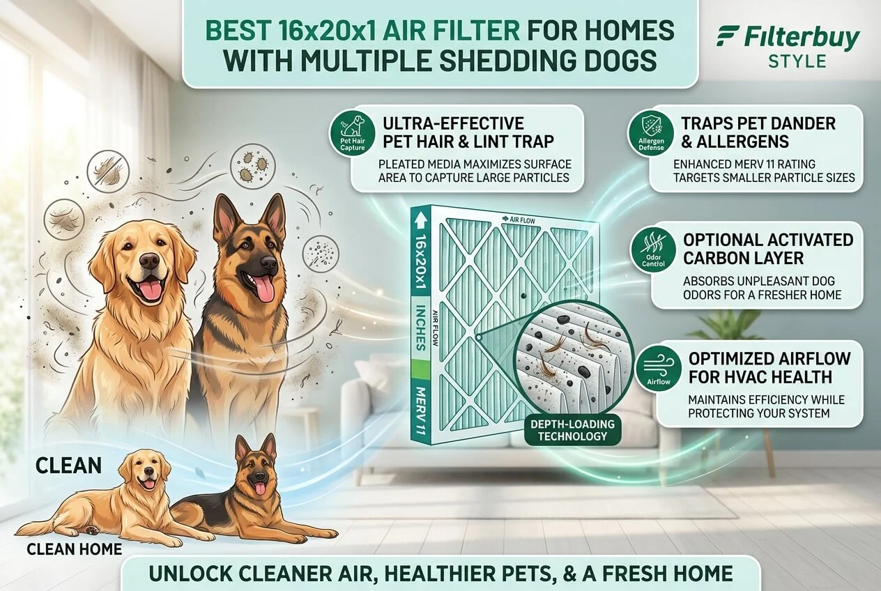 For dog households, the 1-inch depth matters. A thinner filter holds less media than a 4- or 5-inch model, which means it loads faster. Pet hair and dander pack into the media every time the system runs, especially in pleated air filters. Two dogs load a filter roughly twice as fast as one. High-shed breeds during peak shedding season can clog a 16x20x1 in under a month.