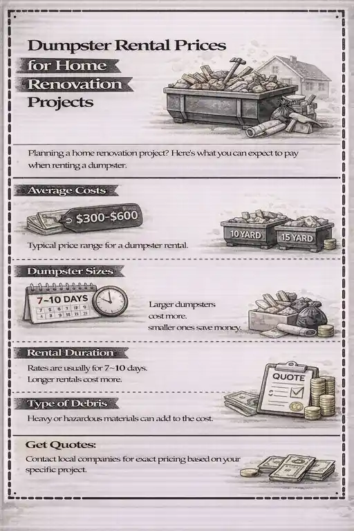 Typical price range: $300–$850+ for most renovation dumpster rentals