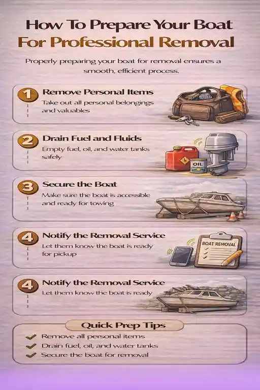 A: Clear out personal items. Address fuel, oil, batteries, and chemicals. Unprepared boats create safety risks and slow removal.