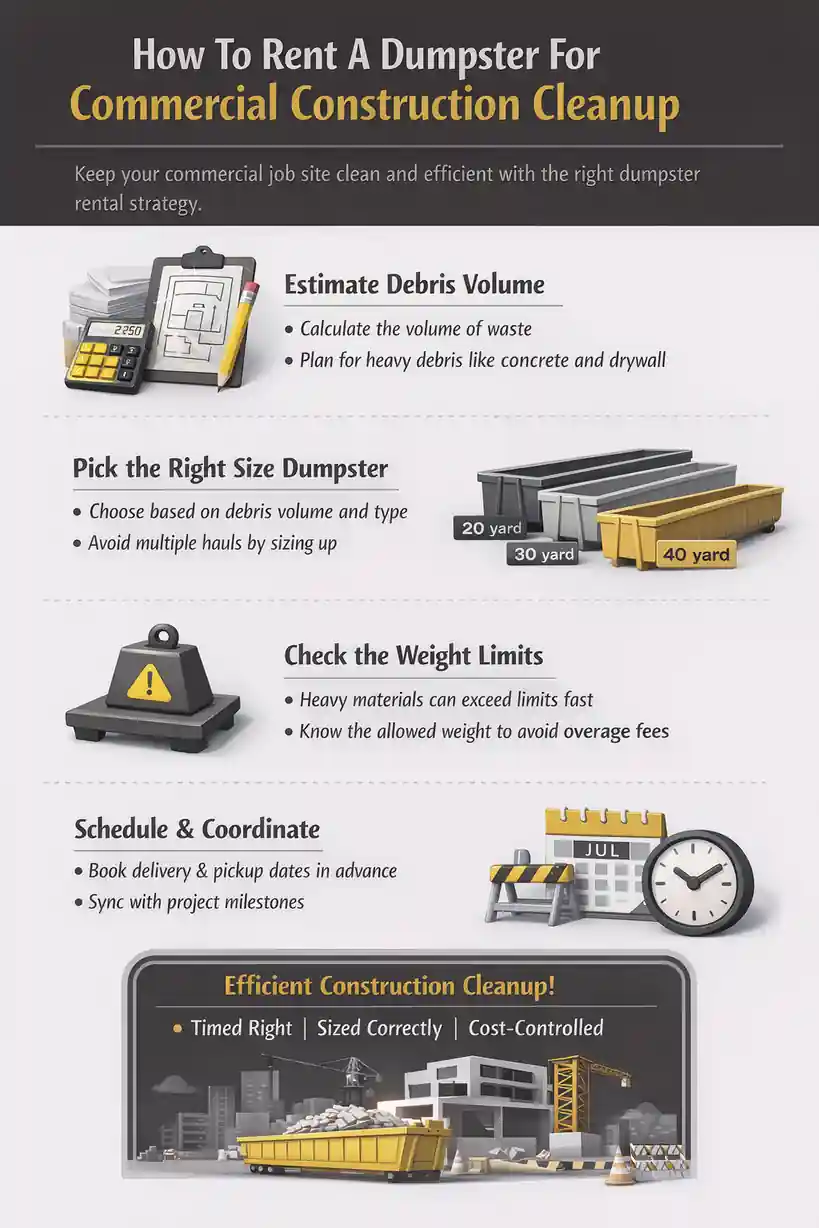 This guide breaks down how to rent a dumpster for commercial construction cleanup with a clear focus on dumpster rental strategy. You’ll learn how to manage heavy construction debris, prevent costly overage fees, keep worksites compliant, and coordinate deliveries and swaps without disrupting active crews. By the end, you’ll have the knowledge to plan dumpster rental proactively, minimize downtime, and keep cleanup costs predictable throughout your project.