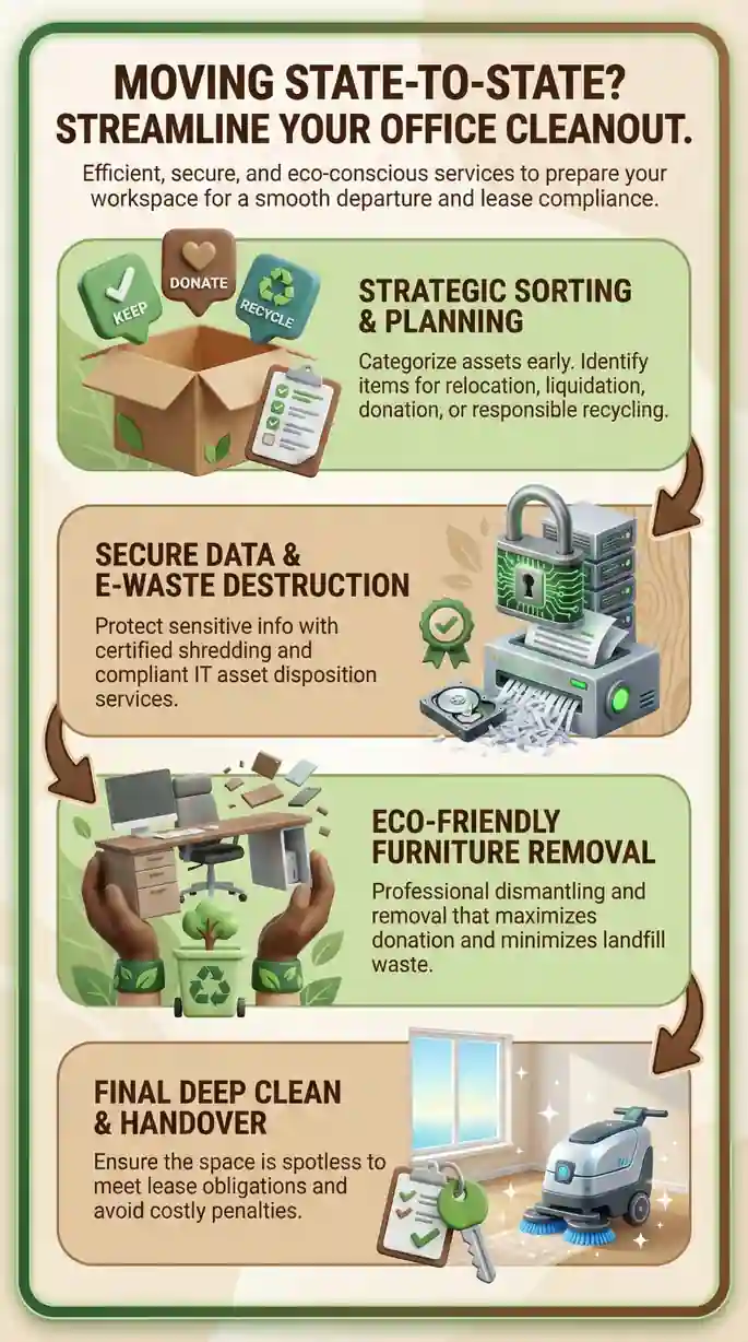 Professional office clean out services remove unwanted furniture, electronics, equipment, and debris from commercial spaces during relocations, closures, or downsizing. For out-of-state relocations, these services require fundamentally different coordination than local cleanouts due to remote management challenges, extended timelines, and enhanced verification requirements.