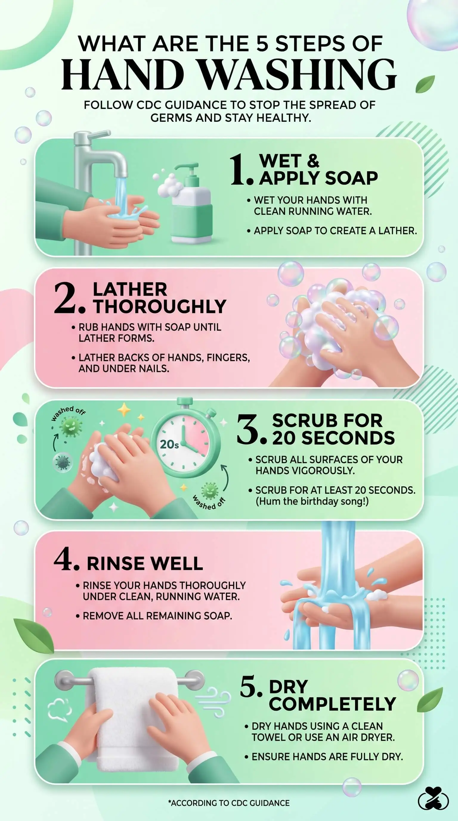 • The five steps in CDC order are: wet, lather, scrub, rinse, dry.