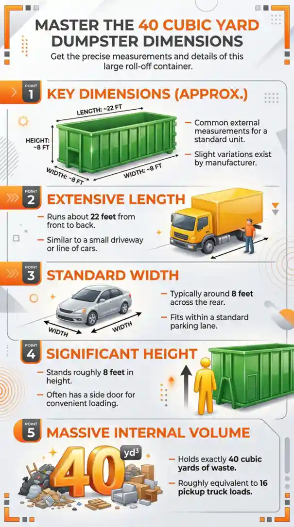 A 40 cubic yard dumpster is not a one-size-fits-all solution — it is the largest roll-off container in standard circulation, and its dimensions reflect that. The typical footprint runs 22 feet long, 8 feet wide, and 8 feet tall. Some manufacturers produce units that vary slightly, ranging from 20 to 22 feet in length and 7.5 to 8.5 feet in width depending on the provider, but these measurements represent the industry standard you can plan around.