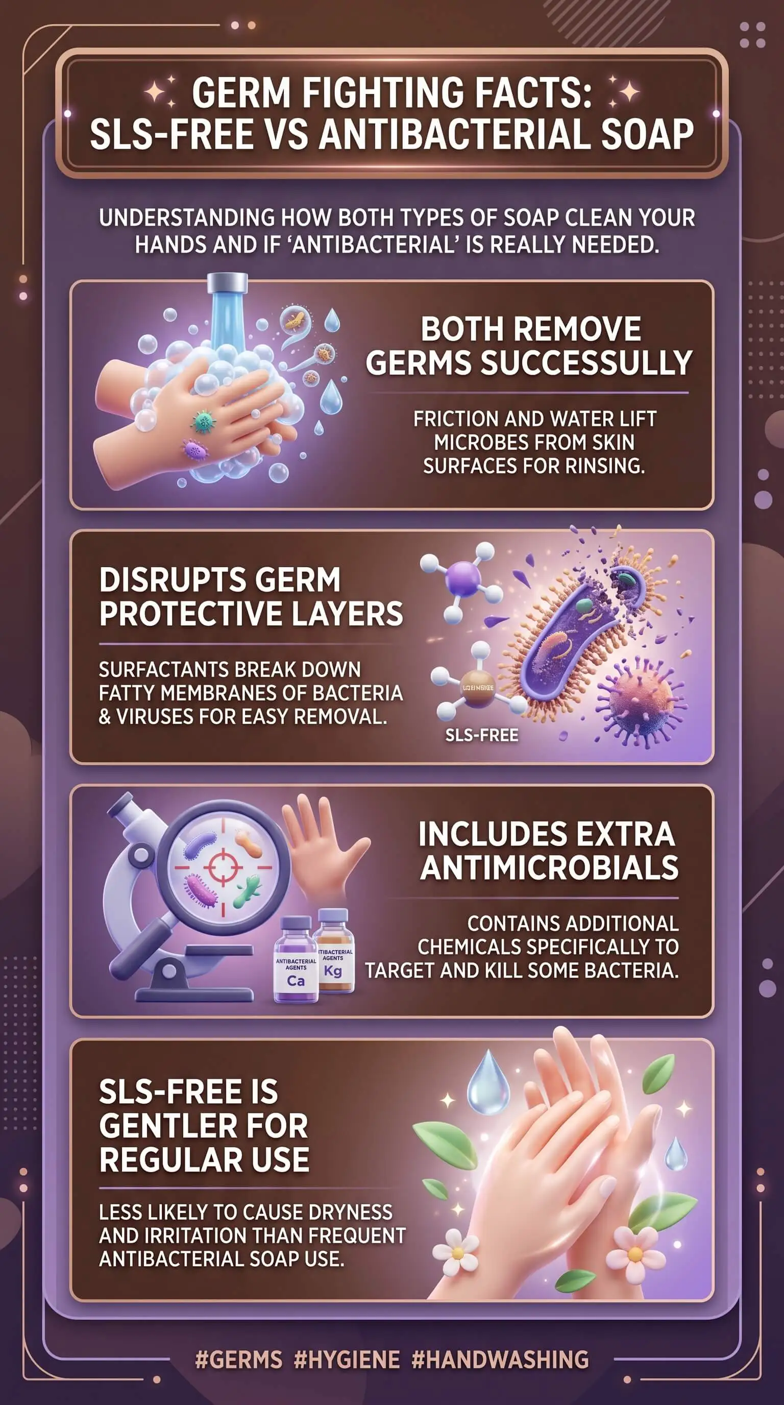 1. SLS free hand soap removes germs as effectively as antibacterial soap. The mechanism is mechanical lift plus twenty seconds of scrubbing, not a chemical kill step.